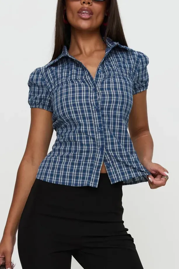 Blue Plaid Fitted Button Down Shirt