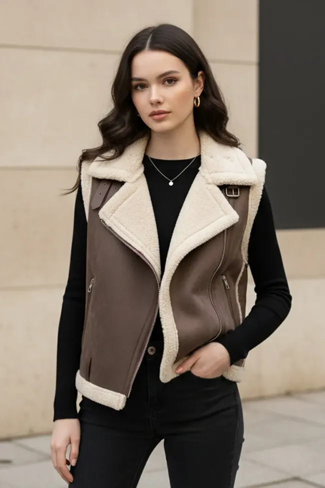 Brown Fleece-Lined Lapel Collar PU Jacket