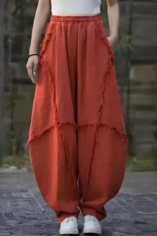 Rust Solid Fringed Barrel Pants